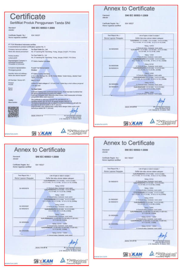 SNI certificate enables Far East Cable"s products to enter the Indonesian market, which provides more possibilities to expand the Indonesian market in the future and is also the most effective proof of the company’s product quality. At the same time, getting the certificate is also an important step for Far East Cable to respond to the Belt and Road Initiative and promote the quality of China"s products.